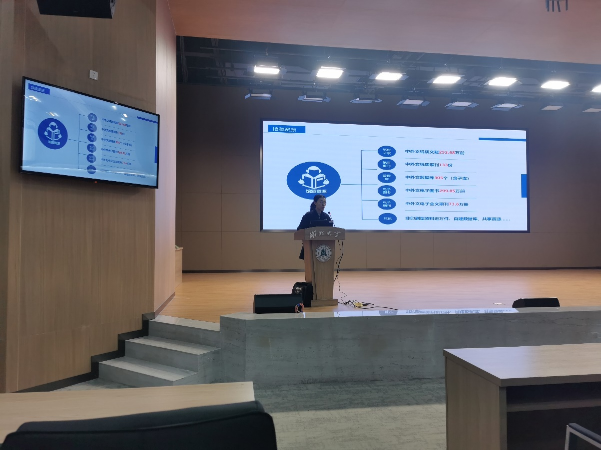 讲座分为四个阶段。第一阶段由校图书馆学科服务与阅读推广部馆员董菡主讲,系统介绍了图书馆概况、资源利用与服务等情况。董老师详细讲解了图书馆的书籍、期刊和数据库等现有馆藏资源及其借阅相关规定,并针对性地对化学学科平台、化学化工学院分馆做了特别说明。通过实例演示,阐述了如何精准定位前沿学术文献,为后期研究与论文写作奠定坚实的资料基础。