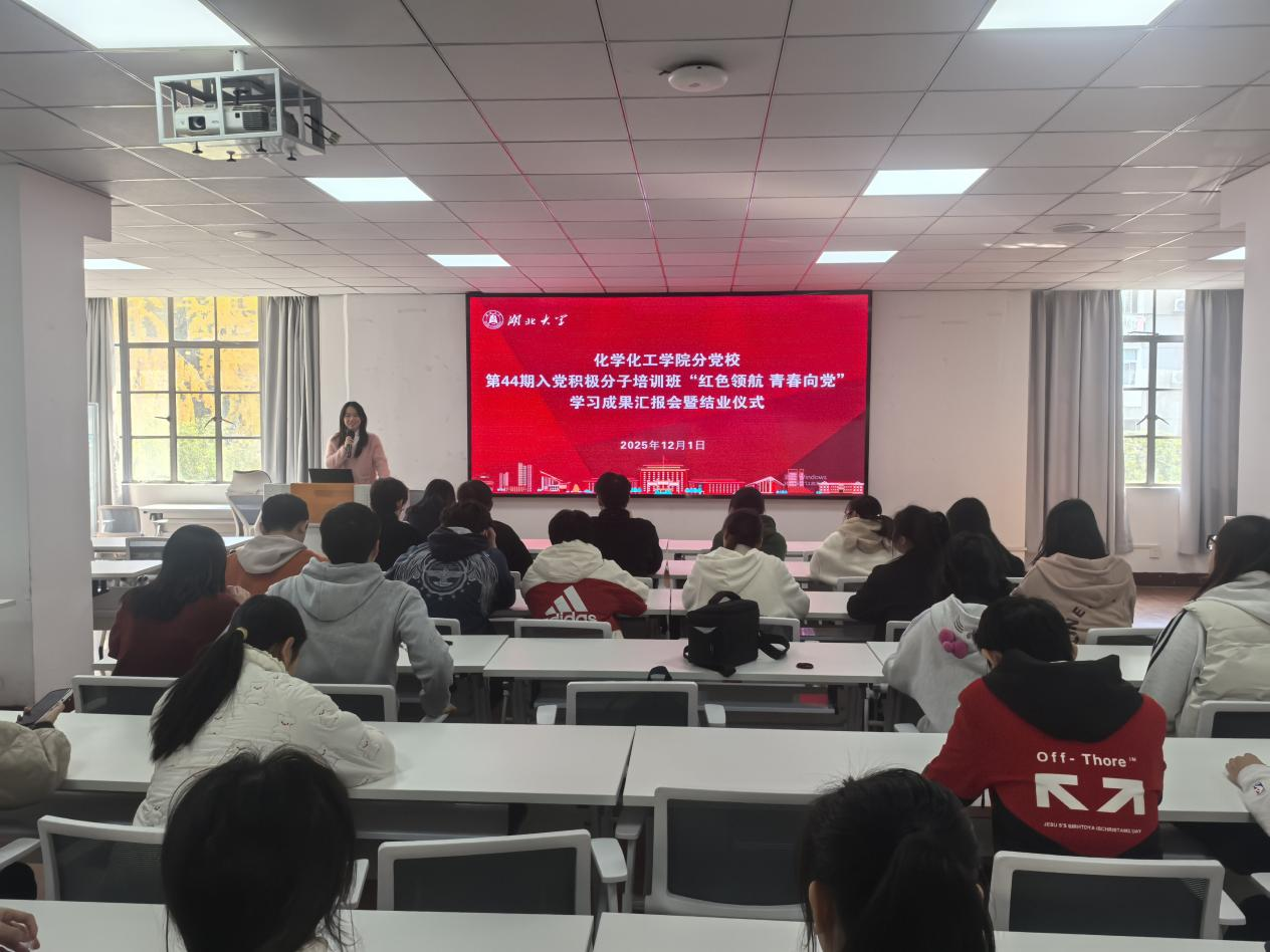11月28日,第44期入党积极分子培训班“红色领航·青春向党”学习成果汇报会暨结业仪式在学院D216报告厅举行。仪式由组织员张文婷主持。大家观看“我们的红色记忆”培训班学习历程视频集锦后,各小组依次进行“我们的红色足迹”实践成果展示。入党积极分子围绕学院分党校提供的红色元素活动库,自主选择并扎实开展了多项主题实践,各小组活动形式多样、内容深刻。有的小组前往八七会议会址纪念馆进行现场学习,有的小组围绕“对话...