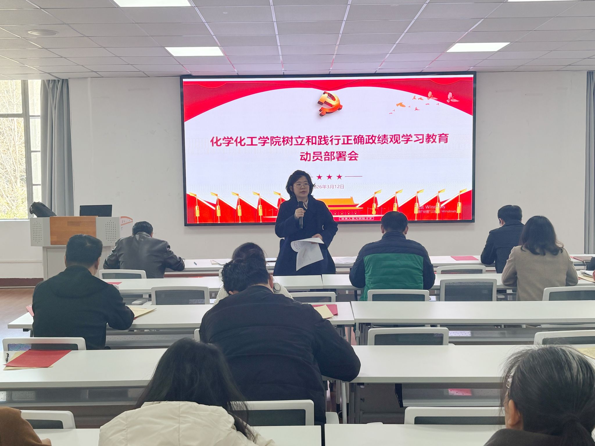 为深入贯彻落实上级党组织决策部署,以正确政绩观引领学院事业高质量发展,2026年3月12日,化学化工学院召开全体党员大会,专题部署开展树立和践行正确政绩观学习教育。学院党委委员、全体教师党员及学生党员代表参会。学院党委书记刘念主持会议并作动员讲话。